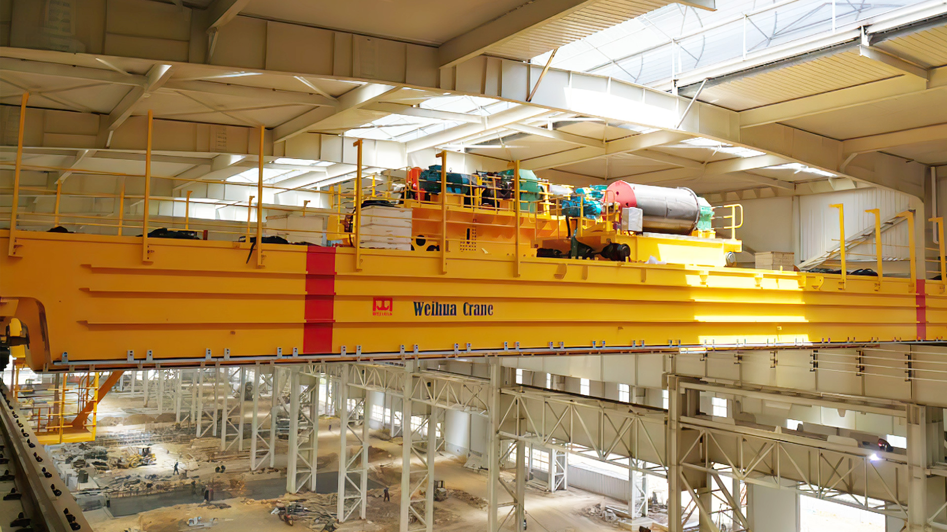 3、桥架结构为三梁四轨设计,主、副梁均采用宽翼缘偏轨箱形结构;